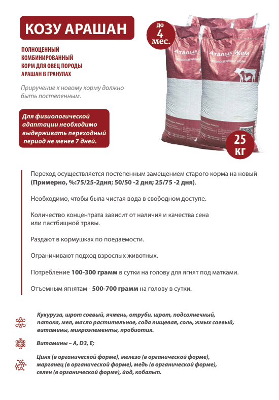 Комбикорм для овец от Аталык Жем — это сбалансированное и высокоэнергетическое питание, разработанное для интенсивного набора массы, укрепления иммунитета и улучшения конверсии корма.