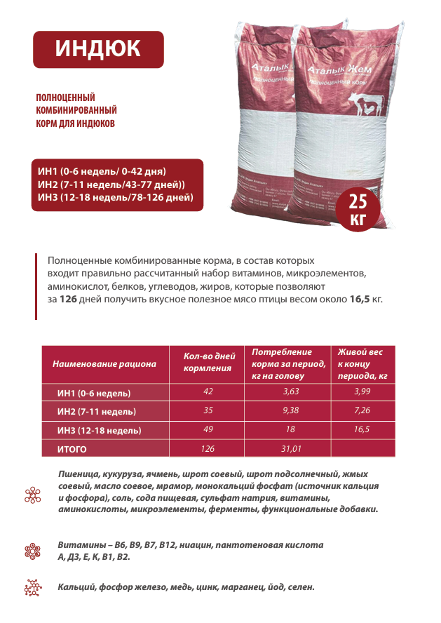 Комбикорм для индюков от Аталык Жем — это сбалансированное и высокоэнергетическое питание, разработанное для интенсивного набора массы, укрепления иммунитета и улучшения конверсии корма.