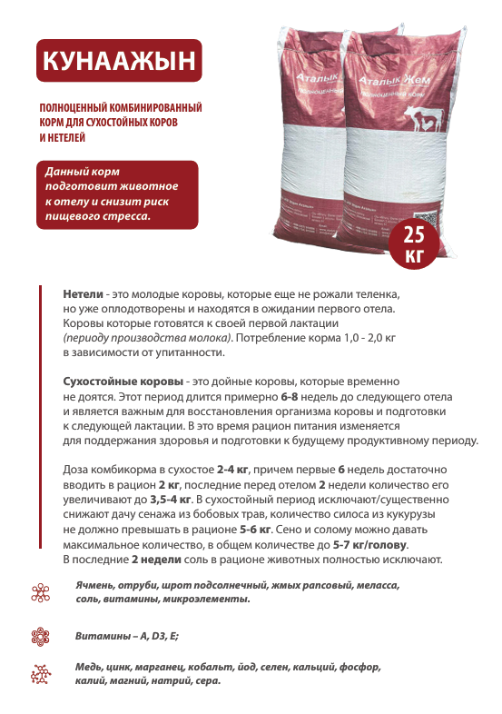 Комбикорм для коров от Аталык Жем — это сбалансированное и высокоэнергетическое питание, разработанное для интенсивного набора массы, укрепления иммунитета и улучшения конверсии корма.