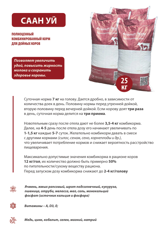 Комбикорм для дойных коров от Аталык Жем — это сбалансированное и высокоэнергетическое питание, разработанное для интенсивного набора массы, укрепления иммунитета и улучшения конверсии корма.